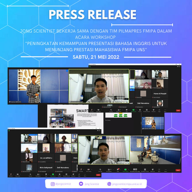 Jong scientist melaksanakan acara workshop dengan tema "Peningkatan Kemampuan Presentasi Bahasa Inggris untuk Menunjang Prestasi Mahasiswa FMIPA UNS". Acara ini merupakan wujud kerjasama Jong Scientist dengan Tim PILMAPRES untuk membantu mahasiswa FMIPA UNS guna meningkatkan kemampuan persentasi berbahasa Inggris. Acara tersebut dilakukan secara hybrid dengan menghadirkan Refa Rahmadiannsyah, S.Ked, selaku pemenang PILMAPRES NASIONAL 2021 sebagai pembicara.